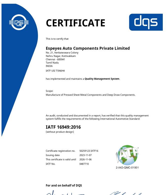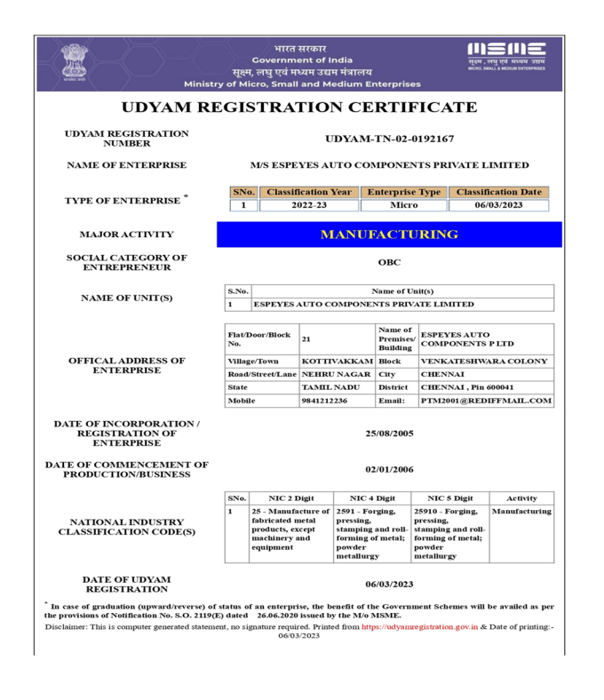 At ESPEYES AUTO COMPONENTS, we pride ourselves on our proven business expertise and our ability to deliver top-notch products on time. Our team continues to nurture the entrepreneurial spirit instilled by our founder, ensuring that we remain at the forefront of innovation and quality in the industry. We are committed to maintaining the highest standards in every aspect of our operations, from product design to manufacturing and delivery.